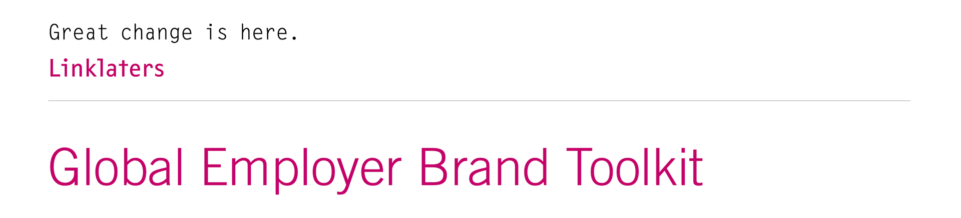 An intensive research project culminating in a brand identity and architechture, including a broad creative toolkit to be taken forward and used by internal teams at global law firm, Linklaters.